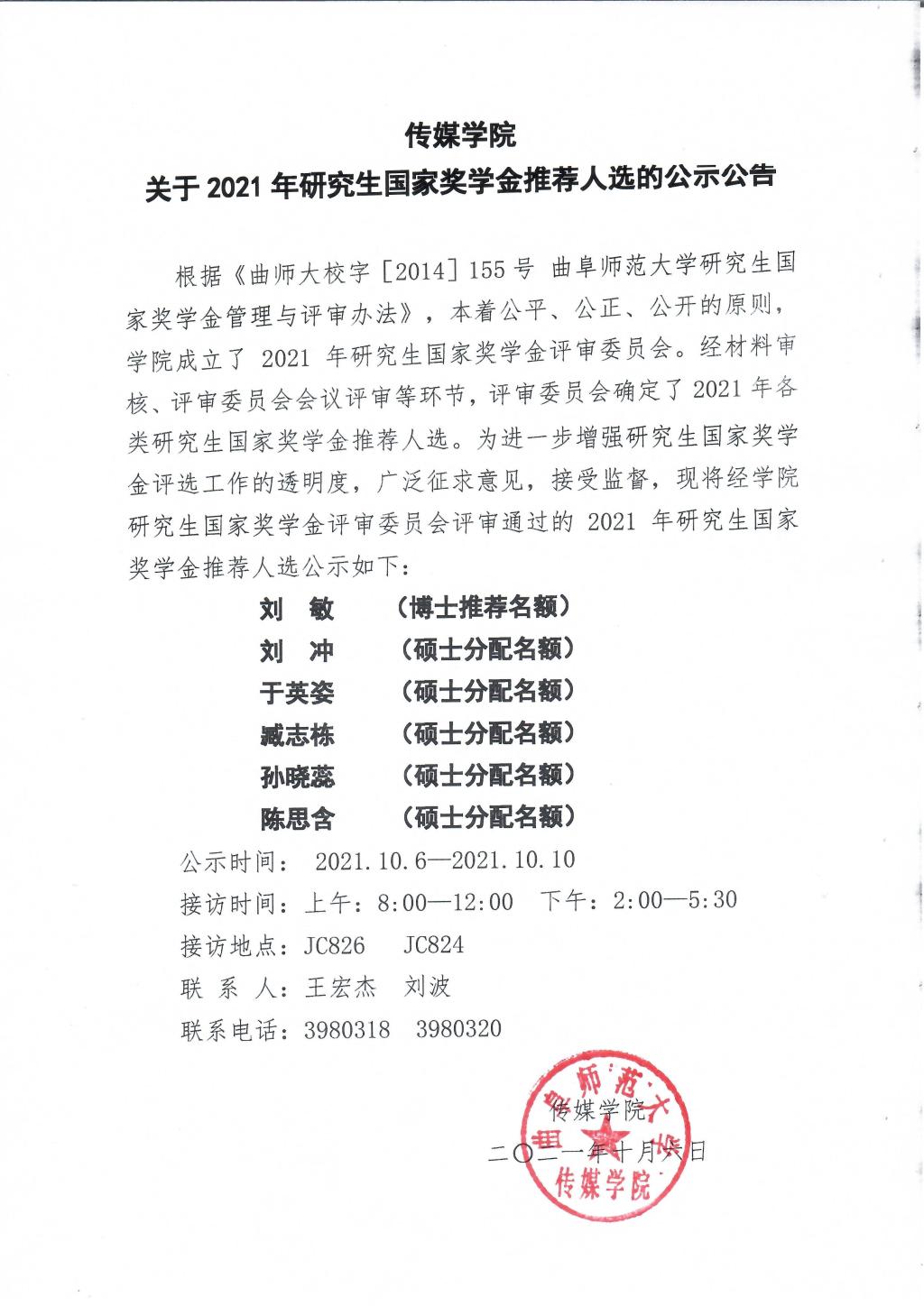 【来源:老王论坛 关于2021年研究生国家奖学金推荐人选的公示公告 | 发布日期:2021-10-06 】