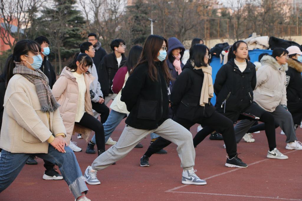 在常规的热身拉伸后,参训人员有序集合进行训练。学院老师在查看过程中,充分肯定了此次冬训成果,对2020级参训人员规模之大给予表扬,并表示,希望同学们进一步发扬吃苦耐劳、顽强拼搏的体育精神,同时表达了对明年的春训及春季运动会的期盼。此外,三位老师还指出,同学们在训练过程中需做好防寒保暖工作,注意安全,在锻炼身体的同时也不要忽视学习,为期末复习做好准备。