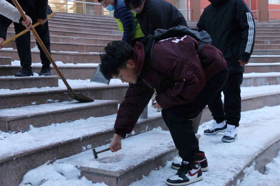 本次扫雪的重点区域为阳光会场,该区域积雪覆盖面积广,道路结冰严重且人流量大,给师生出行造成了极大困扰。老师及学生们携带扫雪工具,到阳光会场进行扫雪活动。他们弯着腰,用扫帚扫去冰面上的积雪。由于过往行人的踩踏,大部分积雪已牢牢贴紧地面,难以扫除,增加了清理难度。老师和学生便用铁锹铲,用锤子凿,他们鼻尖通红,手指僵硬,却依旧干劲十足。经过师生们的全力配合,认真清理,阳光会场的积雪已被清理完毕,干净的会场与努力的师生们构成了冬日里一道亮丽的风景线。