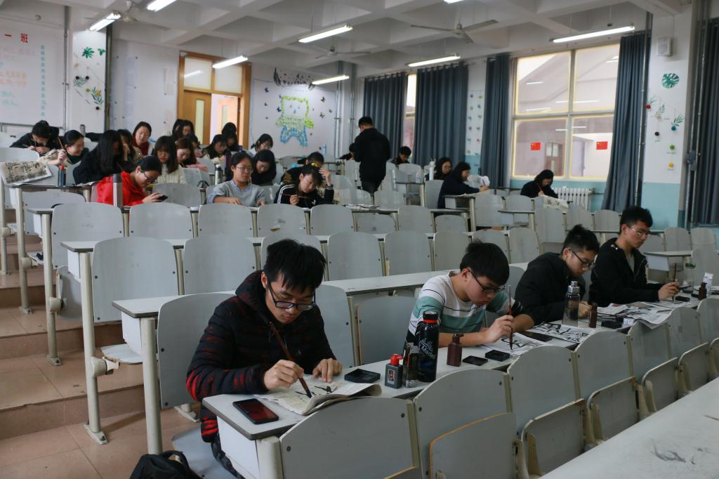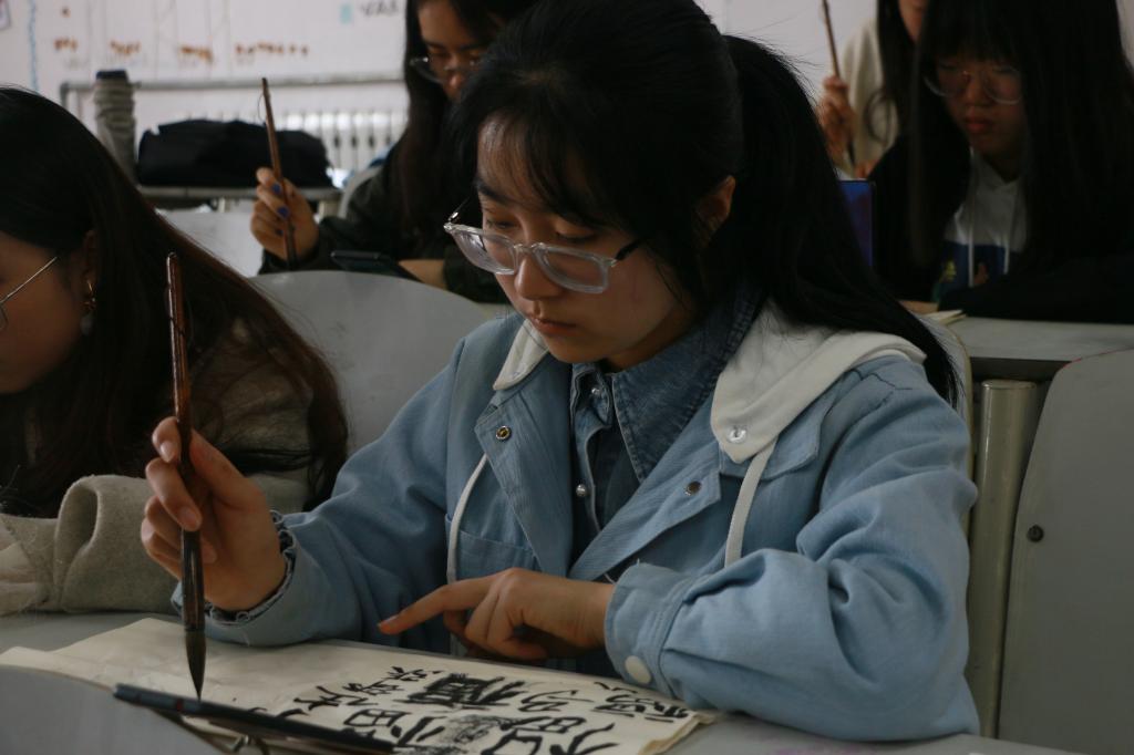 活动伊始,同学们领取了毛笔、墨水和稿纸,而后张明洋向大家讲述了写毛笔字的技巧与方法,他强调写毛笔字一是需要多写多练,二是学习一些书法理论,三是向同时代的名家学习。接下来,同学们正式开始练习,由于底子较薄弱,同学们需从最基础的笔画着手,他们一笔一划的写着每一个字。