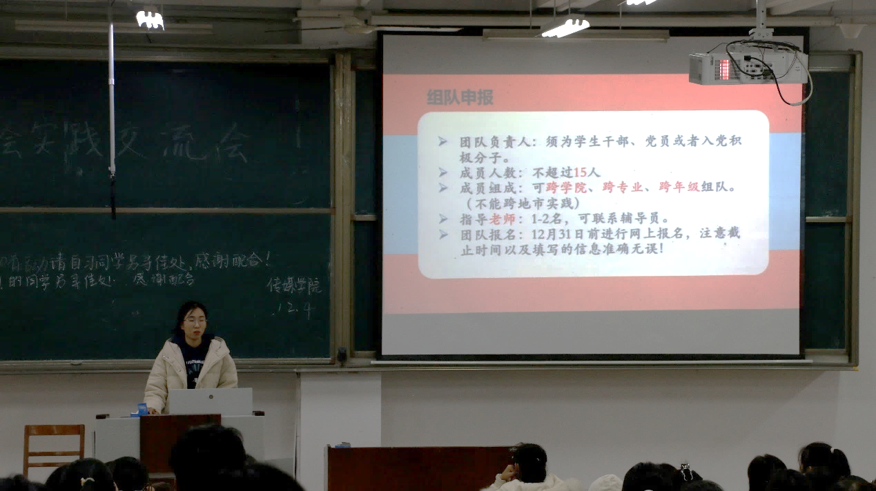 首先,往届“社会实践优秀个人”余叶从实践内容、新闻宣传、实践报告、答辩四部分向同学介绍社会实践的具体流程,并建议结合专业、家乡特色、当今社会热点等方面确定实践课题。其次,焦卓月对实践过程中摄影的构图操作、技巧、功能以及重点注意事项进行总结与分享。最后,刘诺丫针对社会实践流程及社会实践报告撰写方面进行进一步的解释,为社会实践活动队伍顺利开展实践答疑解惑。