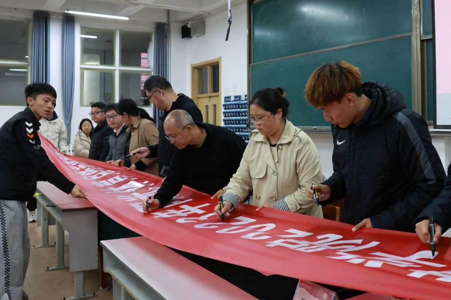 王宏杰强调身体健康对于同学们学习、生活及未来发展的基础性作用,希望同学们能够走出宿舍、走向运动场,展现传媒学子应有的青春风采。田荣林对阳光体育月相关活动安排作具体说明,并希望同学们积极参与到系列活动中,在活动中增强身体素质,磨练意志。2022级新闻一班武星辰作为运动员代表发言宣誓,表达了全身心投入到训练、提高自身身体素质与心理素质,为即将到来的运动会做好准备的决心。仪式最后,领导老师、到场学生依次上台在横幅签字,宣告阳光体育月活动正式拉开帷幕。