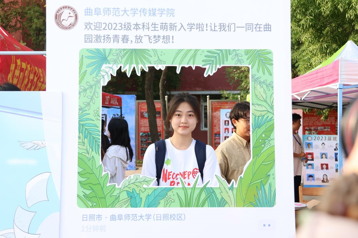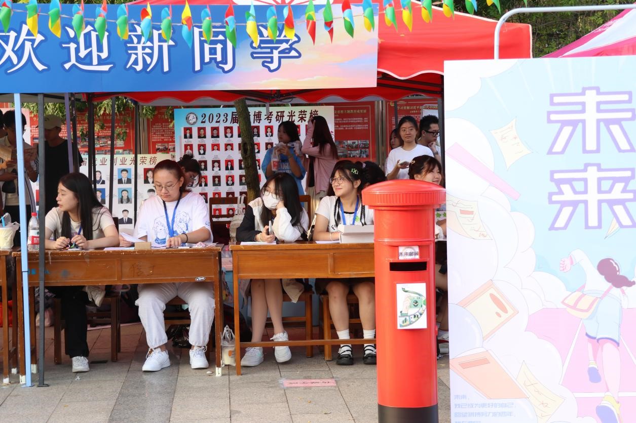 大本营报到处的“过去与未来”打卡牌吸引了众多新生的目光。信息登记等报到流程完成后,新生在志愿者的引导下与打卡牌合影,相机咔嚓声与欢笑声接连不断。“非常有纪念意义的照片,我肯定会一直保留着它,”一位新生说,“这可是我与曲园的初见!”迎新活动还专门设计了“未来邮箱”投递点,新生们将自己对大学生活的向往、自身成长目标写在明信片上,投递到邮箱里,让青春理想经受时光的打磨与锤炼,待到未来毕业时再次开启。在大本营报到点之后,金红色的升学就业光荣榜向新生们展现传媒学子的青春风采与斐然成绩;来往报到的新生以敬佩的目光注视着光荣榜上的照片与名字,“希望四年后,光荣榜上也会有我的名字。”她们纷纷表示。
