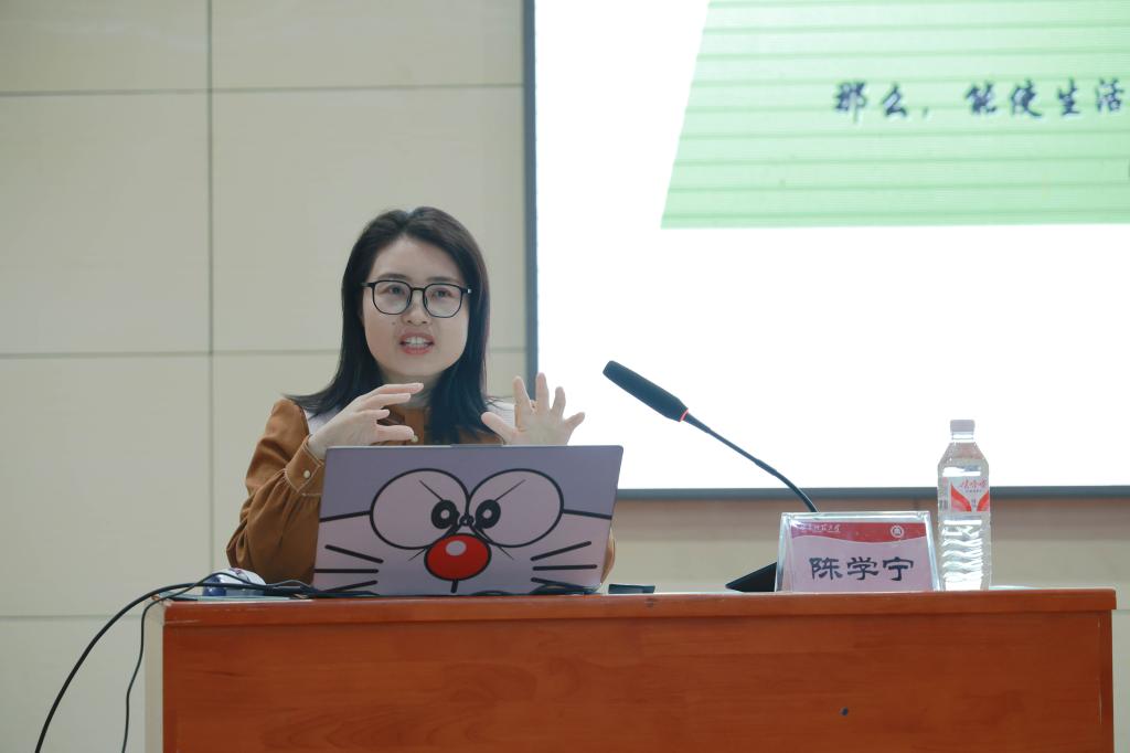 本次讲座以小测试开场,陈学宁通过精心设计的提问,快速调动同学们的注意力,现场气氛活跃、掌声连连。陈学宁用幽默有趣的语言、生动典型的例子和图文结合的方式,详细介绍了什么是心态、如何拥有阳光好心态,引导学生关注自身心理健康,悦纳自我。她认为,心理健康需要我们像呵护一棵幼苗一样,细心照料,不断调整;在这个过程中,自我意识的提升至关重要。要了解自己的情感需求,识别情绪的变化,努力构建内在平和。在自我调整的基础上,陈学宁鼓励同学们在与同伴交往的过程中建立情感连结,构筑同伴支持网络。