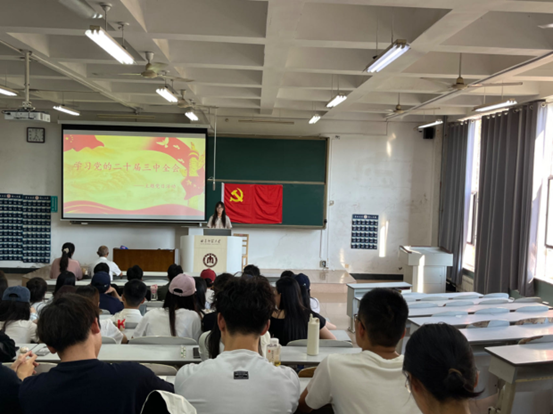 本次党日活动以“学习党的二十届三中全会”为主题,本科生第一党支部书记武莉华带领全体党员集体学习了党的二十届三中全会精神的相关新闻报道,学习领会了习近平总书记关于全面深化改革、推进中国式现代化的一系列新思想、新观点、新论断。田荣林从党的二十届三中全会审议通过的《中共中央关于进一步全面深化改革、推进中国式现代化的决定》的丰富内容、全面准确理解进一步全面深化改革的重大举措以及提出的“七个聚焦”等方面,对党的二十届三中全会的精神要义和实践要求作了深刻解读。他谈到,党的二十届三中全会是新时代新征程上推动全面深化改革向广度和深度进军的总动员、总部署,全体党员必须深入学习贯彻党的二十届三中全会精神,总结全面深化改革以来的经验并灵活运用到日常学习工作中,为服务学院高质量发展作出应有贡献。