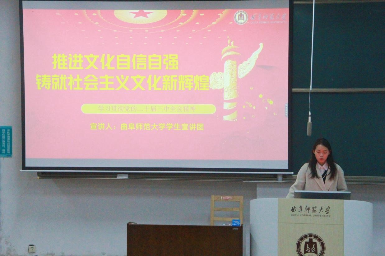 本次宣讲以“学习贯彻党的二十届三中全会精神”为题,围绕“推进文化自信自强,铸就社会主义文化新辉煌”和“万里磅礴看主峯,党建引领事业兴”等领域,聚焦社会主义文化自信、党的建设和党的领导等内容依次展开。宣讲团学生详细介绍了党的二十届三中全会的基本情况,并以在党的建设和领导下取得了一系列经济、政治和文化领域的成就为例,深刻阐述了党的二十届三中全会的科学内涵和重大意义,展望了中国式现代化的壮阔前景。他们谈到,我国在改革开放中取得历史性成就、发生历史性变革,也必将在进一步全面深化改革中再创新辉煌、铸就新伟业,希望同学们能把爱国情、强国志、报国行融入血脉,为谱写中国式现代化挺膺担当。