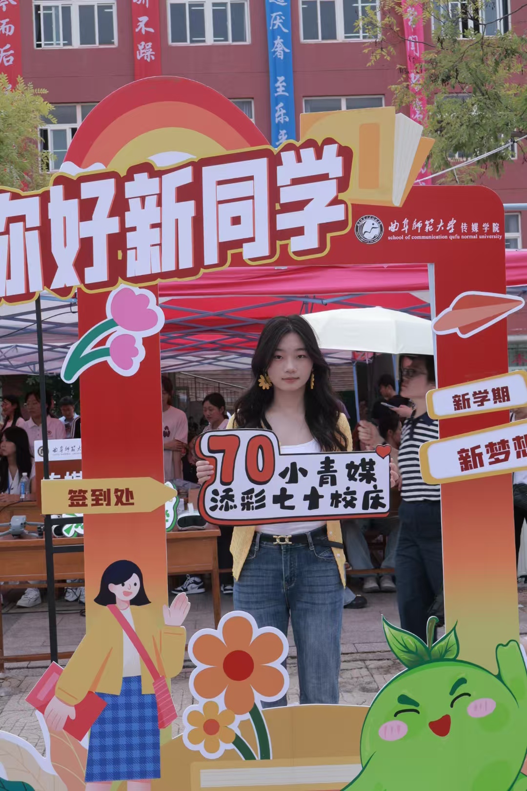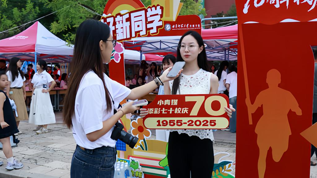 2025级的“小青媒”们非常积极,纷纷在有着七十周年校庆元素的打卡点前合影留念,并接受采访,分享感悟。