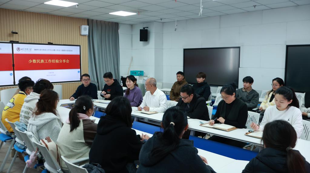 于JC813召开少数民族工作经验分享会。会议由2020级数媒专业史金阳担任主讲,党委副书记田荣林以及各年级辅导员参与会议。