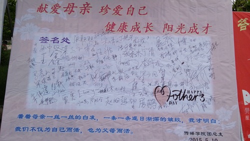 本次活动于当天上午11:00圆满结束。本次“献爱母亲——母亲节签名活动”取得了极大反响,吸引了广大同学的热情参与,不仅唤起了同学们对母爱亲情的感恩之心,更为不在母亲身边的学子们提供了一个传达感情、倾诉内心的平台,为远在家乡的母亲送上了母亲节最真挚的祝福。献爱母亲,珍爱自己,相信环抱感恩之心的同学们会在曲师走向更加阳光与健康的未来!