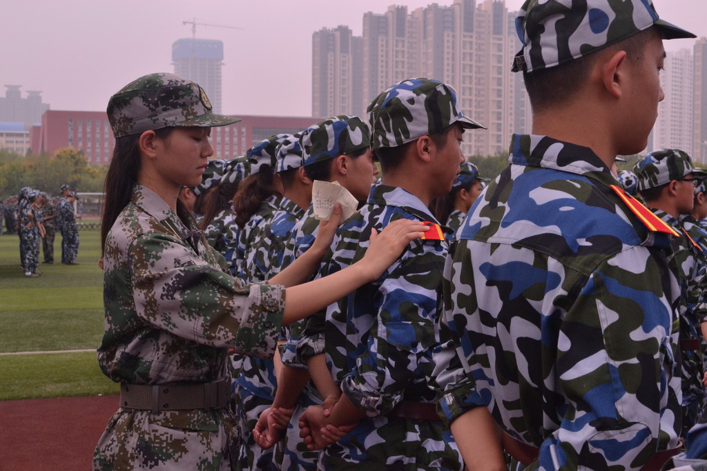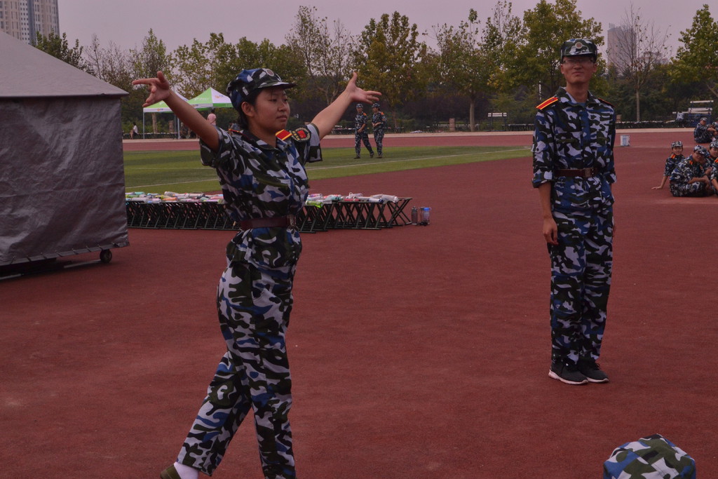 新生个个都以饱满的热情接受太阳的洗礼。训练有素的教官在烈日下严格的教授跨立姿势,认真仔细的纠正新兵的每一个错误姿势。他们以身作则,将铁的纪律带到新兵面前,教会新兵应该有的军人风范。