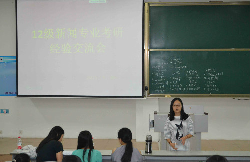 2012级新闻专业在A101举行了考研经验交流会。此次交流会分别邀请了考取国际关系学院研究生的王楠、上海交通大学研究生的董晓伟、首都师范大学研究生的王丽丽和烟台大学研究生的谭竺青与大家交流考研经验。