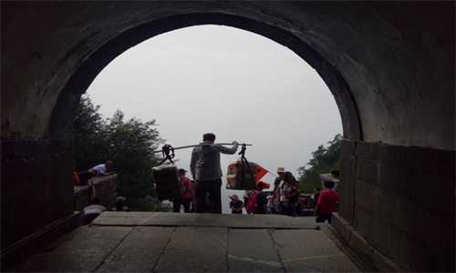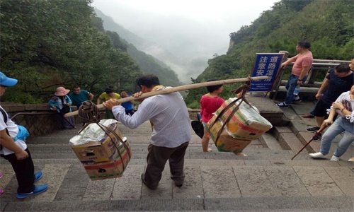 泰山素有“五岳之尊”“天下第一山”之称,挑山工肩扛货物,山上的吃喝用度、建筑材料,由他们一担一担运送。从红门至南天门,全程约7.9公里,海拔1500余米、需登台阶6900余阶,山路陡峭,气候多变,挑山工的劳苦以及他们对此的坚持,正是人们对之肃然起敬的原因。