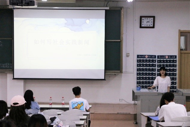 新闻部部长吴瑞铮、学校大学生记者团摄影部部长孙序文,经济学院社会实践部副部陈欣怡、宣传部副部于潇霄、社会实践部副部封金研担任主讲人,本次会议由刘沛锦主持。