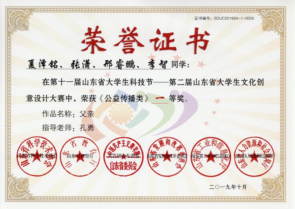 近日,“第二届山东省大学生文化创意设计大赛”颁奖典礼隆重举行,本次比赛由山东省科学技术协会、山东省教育厅、共青团山东省委、山东省发展和改革委员会、山东省工业和信息化厅、山东省人力资源和社会保障厅联合主办。我院数字媒体艺术专业学生夏泽铭、张潇、邢睿鹏、李智创作的动画作品《父亲》荣获公益传播类一等奖,团队指导老师孔勇荣获优秀指导教师称号。