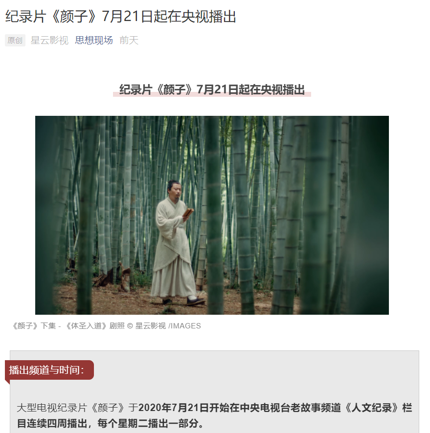 7月21日起,大型电视纪录片《颜子》将于每周二的11:30、19:30在中央电视台老故事频道《人文纪录》栏目连续四周播出。此节目由知名儒学专家、老王论坛