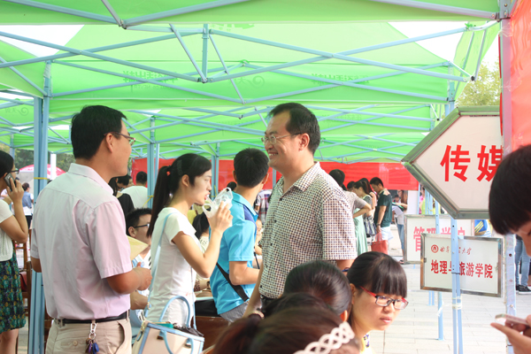 飒爽九月,志存高远,2014年9月6日,按照学校的部署和安排,我院开展了2014级研究生的迎新工作。在这繁忙热闹的一天中,学院负责的师生各司其职,迎新工作进行的有条不紊,共迎来了92名研究生。此次迎新活动,事物繁杂,工作量大,为此学院领导和老师高度重视迎新工作,提前制定了详细的迎新方案,力求做到高效、周全、细致。我院研究生会成员是迎新工作的骨干力量。6日早上7点20分,迎新工作负责人就到达指定迎接点,开始忙碌起来,为一天的工作做好了充分的准备。