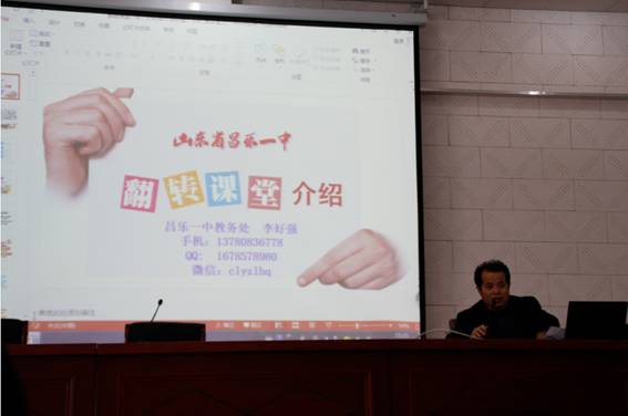 下午3:00,李兴保、胡凡刚一行在昌乐一中的英才报告厅参加了关于“翻转课堂”的专题报告会。昌乐一中教务处主任李好强担任主讲人。李主任从四个方面向在场师生介绍了“翻转课堂”的优势以及目前在一中的发展情况。在听报告的过程中,师生们时而低头做笔记,时而低头思索。