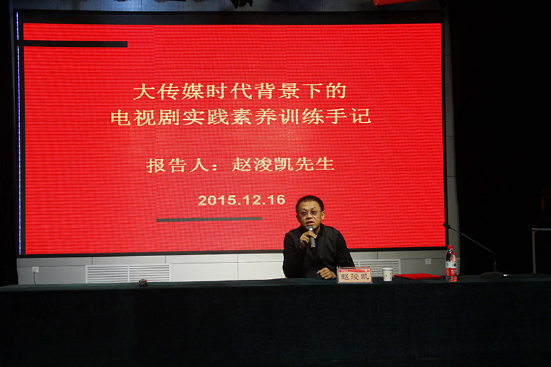 聘任仪式结束后,赵浚凯以“大传媒时代背景下的电视剧实践素养训练手记”为题带来了精彩的报告会。赵浚凯首先结合自己在一线的经历,从中国电视剧产量等数据及中外对比,指出当下的大传媒时代是一个充满机遇的时代。赵浚凯建议大家树立“互联网+”观念,他指出,智能产品的出现及抓点阅读方式的产生,政策背景、文化背景、技术背景、实践背景的发展与完善极大地改变了人们的思维方式和行为习惯。互联网给每一个行当带来巨大的商机,而中国各行各业的野蛮式生长使中国已在互联网方面走在世界的前沿。当今的时代提供给同学们广阔的平台、无限的机会和巨大的生存空间。他说,“做任何一个产业,任何一个行当,成功与否一个是个人的努力,更重要的是与时代的需求以及这个时代对该行当的约束、变革、裂变及它的生长空间”。他还建议同学们:只要正确认识,把握好方向,认清自身位置,符合时代要求,就会在最好的时代实现自身理想。