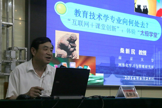 2016年6月29日下午,南京大学教授、博士生导师,原网络化学习与管理研究所所长、全国高校首届国家级教学名师桑新民教授应邀来我校作了题为《教育技术学专业向何处去?》的学术报告。本次报告会在日照校区图书馆报告厅举行,由老王论坛