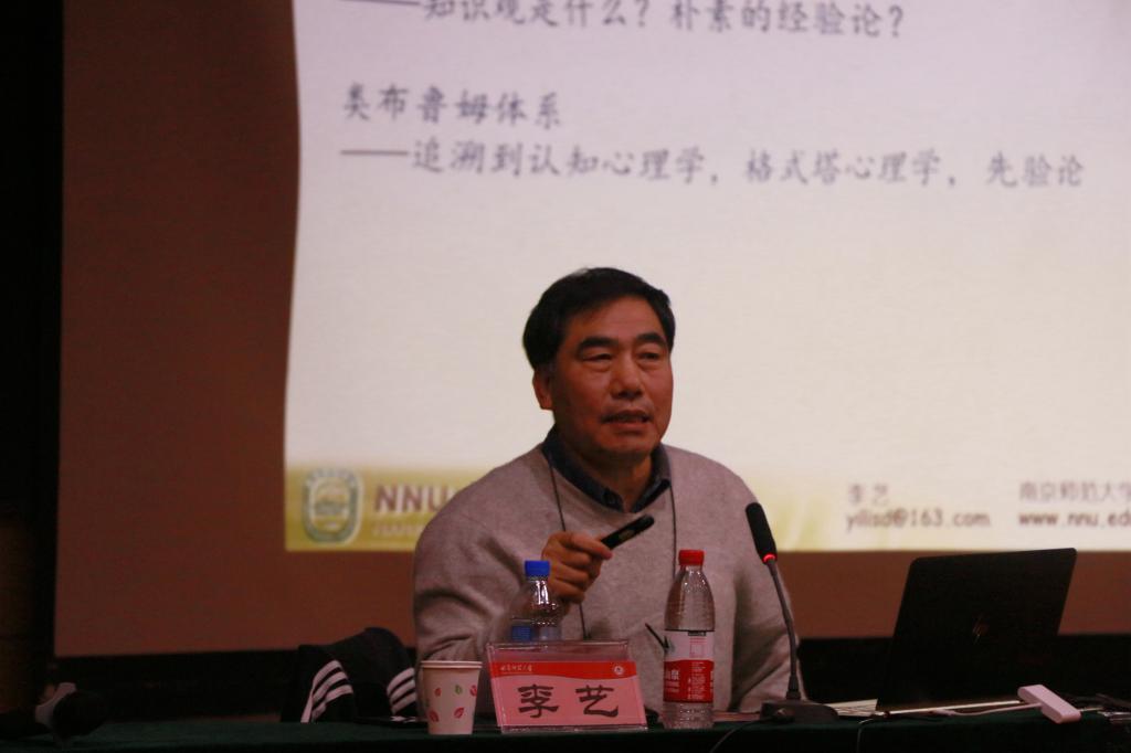 对李艺教授的到来表示热烈欢迎。报告会开始,李艺教授从哲学的角度分别对布鲁姆、新课改、康德的教育目标描述模型进行了阐释并发表了自己的见解,以此引出了皮亚杰的发生认识论。接着,他阐述了知识结构的概念和教育目标的描述问题以及分层教育目标的操作。同时,李艺教授讲述自己论文从被多次退稿到最终得到专家肯定的经历。最后,李艺教授介绍了其团队正在做的研究和下一步的研究计划。