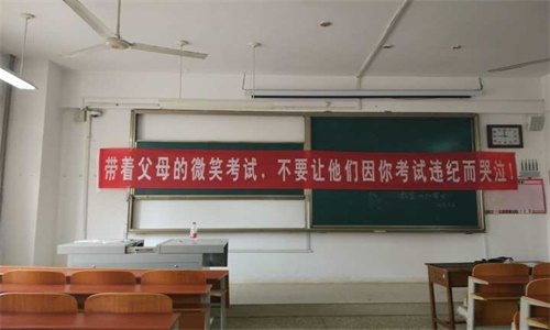 考前,我院团委学生会于考场特张贴考试条幅。张贴的条幅不仅作为我院考生期末考试的鼓励及警示,也是我院严肃对待期末考试,倡导考试诚信、杜绝考试作弊的态度。“与携手诚信,与舞弊挥手告别”、“带着父母的微笑考试,不要让他们因你考试违纪而哭泣!”等考试标语发人深省,成为我院期末考试考场布置的一大亮点。