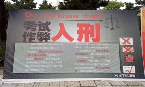 期末考试来临之前,我院于学校北门张贴考试展板。“考试作弊入刑”六个醒目的大字印刻在展板上,警醒着每一位同学们:拒绝考试作弊,诚信对待考试。我院一直坚持严肃考场纪律,倡导考试诚信,杜绝考试作弊的原则,考前做好警示、同学们签写考试倡议书,考后严肃处理,发现考试作弊绝不姑息。对这次期末考试营造了公平、良好的氛围。