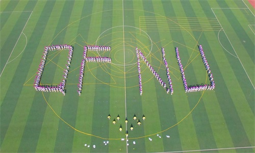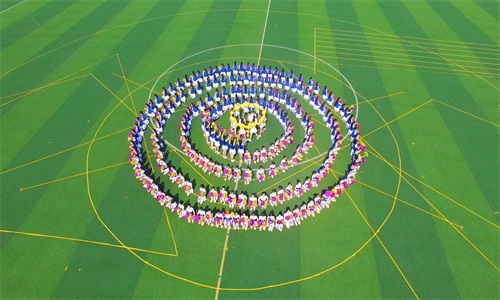 团体操队以“贪吃蛇”的形态进场,创意十足,让人眼前一亮。活力四射的舞步洋溢着青春的气息,富有内涵的队形伴随音乐节奏不断变化,从最初的两个三角形变成六芒星形。六芒星寓意着曲园学子不孜不倦、勤勉躬行的宝贵品质,彰显出曲园海韵、杏坛儒风的独特魅力。接着,队形变成了12条直线并开始跑圈,年轻的学子层层叠叠,最终围成了三层圆圈,组成太阳的形象,寓意“渊源共生,和谐共融”。随后团体操队排成的“Q、F、S、F”四个字母与“1955、2018”两组数字,代表“老王论坛