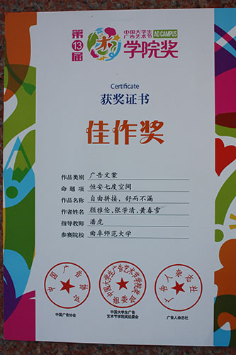 师生在比赛中发挥了大学生的创新精神和实践能力,积极动手、团结协作创作出优秀的设计作品,其中由潘虎老师指导,颜雅伦、张学清、黄春雪同学创作的广告文案类作品《自由拼接,舒而不漏》荣获佳作奖,由苗红磊老师指导张国英同学创作的平面广告类作品《快克儿童》荣获佳作奖;由刘成新老师指导的王晓婷、王宝秀、牛佳雯一组同学的影视广告类作品《多样青春》获得优秀奖;潘虎、刘成新老师获得“优秀指导教师”荣誉称号。