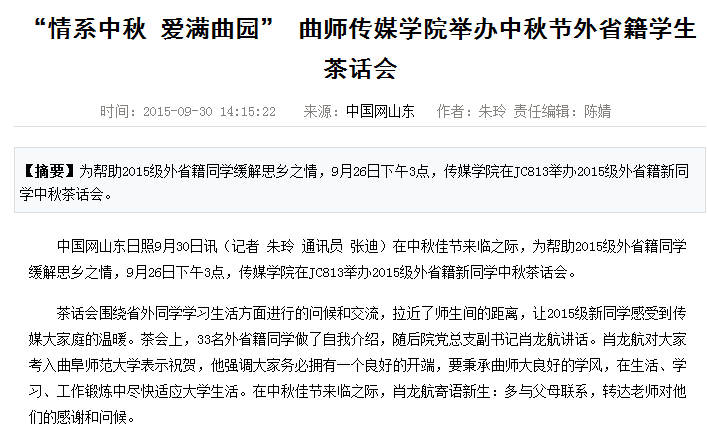 【来源:中国网报道:曲师老王论坛 举办中秋节外省籍学生茶话会 | 发布日期:2015-10-06 】