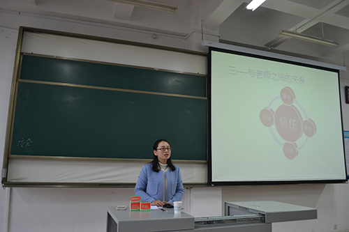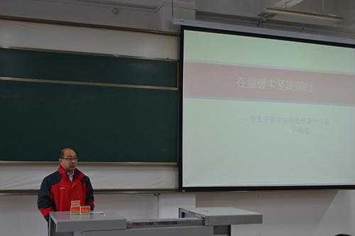 本次课程以“学生干部如何处理各种关系”为主题展开培训。首先,卢瑞霞引用马克思、孟子、罗斯金的名言强调处理好人际关系的重要性,并指出学会处理人际关系是人生的必修课。随后,卢瑞霞围绕“与老师的关系、与同学的关系、个人与学习的关系、与异性的关系、与家庭的关系、与社会的关系、眼下拼搏与长远利益的关系”七方面进行全面细致的讲解。其中,在谈到与老师的关系时,重点强调了“信任、真诚、谦逊、敬爱、沟通”十个字,要想很快的学到知识,重要的是尊重老师;在处理与同学关系时,提出四个原则:求同存异、求解存私、求长存短、求近存距,要做到由近及远,以处理好宿舍关系为前提。卢瑞霞表示在学习中要处理好学习时间、学习效率、学习动机与工作间的关系,要学会统筹、学会吃苦、学会学习,充分调动学习工作的积极性,树立终生学习的意识。在处理家庭问题时,要尊重父母意愿,时刻谨记“父母在,不远游,游必有方”的古训。
