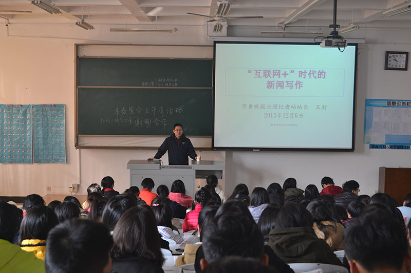 团总支书记、15级政治辅导员刘蓉开场,齐鲁晚报日照站站长王封主讲了题为“‘互联网+’时代的新闻写作”的讲座。