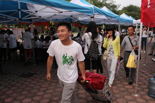 的标牌、考研考公光荣榜、2014级新生签名墙、报到流程导航图以及温馨提示,方便新生报到;大本营后方设有家长休息区,学院向新生家属提供热水、矿泉水,让舟车劳顿的家长们可以舒心休息。迎新大本营内设有新生报到组、手机卡激活、问询处、宿舍录入处,领取饭卡等流程,新生在礼仪引导员的帮助下逐步完成报名登记。在后勤机动处,工作人员将帮助新生提拿行李,带领新生来到宿舍园区,待学生安置好入住后才返回大本营继续工作。