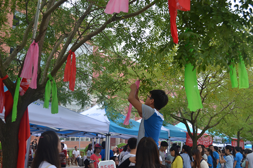 迎新工作全面展开。前台工作人员统一穿着正装,学院专门定制迎新工作服、袖标等物品,彰显了传媒学子的团结统一。工作人员在树枝系上五颜六色的彩色绸带,并装饰以小玩偶,让新生感受到家的温暖。大本营旁设有老王论坛