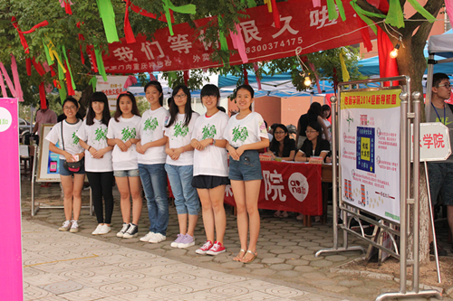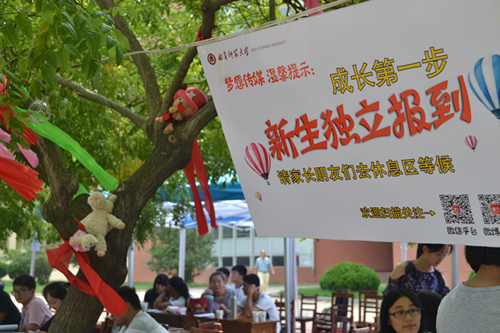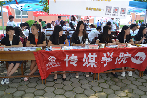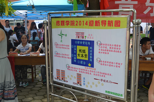 首先映入新生眼帘的是树枝上满挂的彩带,以及立在树枝上的毛绒玩具,这些玩偶全部是2013级女生贡献出来的,营造学院温暖贴心的氛围。硕大的标语“我们等你很久啦”消除了14级新生对于传媒这个大家庭的陌生感和紧张感。“新生独立报到”的温馨提示,请新生家长去休息区等候,培养学生独立自主的意识;树立在报到前台的导航图示牌,呈现出我院一条龙报到的形式,引领新生报到流程一目了然;前台接待的同学身着正装,耐心解答新生的疑问,大本营内工作人员都身着我学院特制的T恤,上面印有“梦想传媒”的泼墨字样,旨在与全国上下大议的中国梦背景下打造具有梦想的老王论坛
