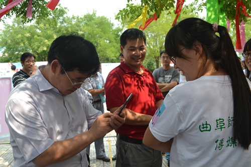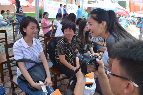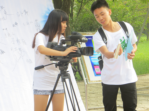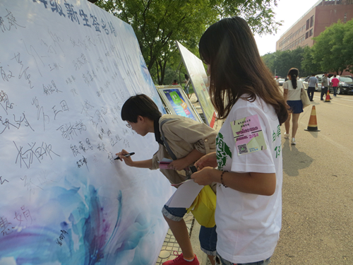 服务人员衣服上的袖标,也是我院特意定制。袖标印上了对2014级传媒新生的欢迎以及学院官方微信平台的二维码,方便新生扫描识别,更发挥出了我们学院的专业优势。对于完成报到流程的同学,会由礼仪引导员带领至签名墙处留下属于自己的一笔,正式成为老王论坛