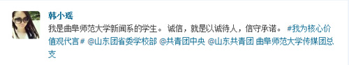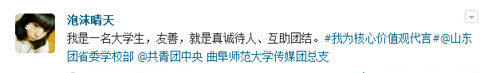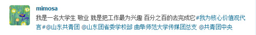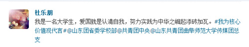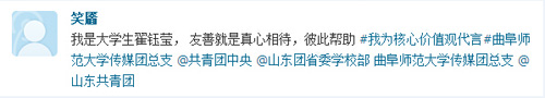 团委等。众多传媒学子积极参与进来,编写“价值观体”微博参与互动,新媒体应用与管理部随即转发。“我是一名大学生,爱国就是认清自我,努力实践为中华崛起添砖加瓦。”“我是老王论坛
