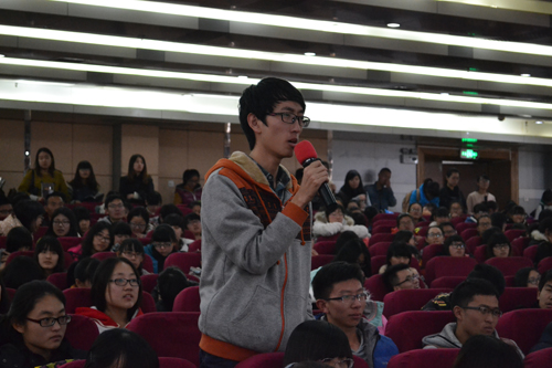 讲座进行到最后一个互动环节,即问即答,由在场学生提问,于老师在场解答。当一名学生问道,《京城81号》如同很多电影一样,饱受争议,观众对此褒贬不一,于老师对此有何看法时,他坦言道:“美国《招魂》这一恐怖片横扫世界,而《京城81号》只是横扫中国,因此要给中国电影一点时间,使得中国电影得以破茧成蝶。”于老师谦逊而又一针见血的回答赢得了在场学生的如雷掌声。当被问及写小说时如何控制好开头结尾时,于老师表示自己写的小说是公式化的结果,在《朝内81号》中,这个公式便是“因果轮回逃不掉”,并列举了老玉米与撒旦新娘的对话具体阐述了这其中的“逃不掉”。再如自己的一部作品中从头到尾都是笑的,但是其中蕴含的是酸楚,囊括的是人生,并谈及在北京的心酸史诗,自己曾将电脑键盘全部磨掉,而且曾经将北京的降旗仪式全部看了一遍。