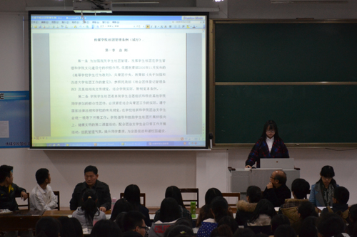 文体社团管理工作促进会议于JA101成功举行。学院党总支副书记、2014级政治辅导员肖龙航,团总支书记、2013级政治辅导员刘蓉,2014级政治辅导员李兴,助理辅导员张亚楠、师衍辉等出席了此次会议。会议由刘蓉主持。