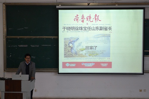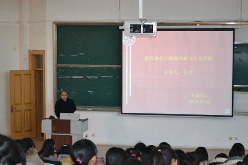 第四届新闻写作培训班第五讲在JE101室举行,齐鲁晚报日照站副站长王封受邀担任主讲。讲座开始之前我院党总支副书记,2014级政治辅导员肖龙航发表讲话,鼓励同学们利用好本次讲座为大家提供的学习契机,学为所用,为将来更好的发展奠定基础。 随后,王封围绕“全媒体时代记者的修炼,合格记者必备的素养”开始本次培训。王封首先介绍了齐鲁晚报的版面及其特色栏目,并以“拒做手机奴”话题为契机,呼吁同学们积极阅读纸质媒体,积极投稿写文章。随后,王封指出全媒体时代改变了人们的生活及阅读习惯,但并未改变新闻报导的本质使命,并就目前传统的纸媒危机提出了自己的见解,他说:报业危机,危中有机,高品质的内容是核心竞争力的灵魂。王封就一个合格记者的必备素养提出了几点具体要求:学习广泛涉猎;保持政治敏感度;大胆提问、重视言论;精益求精。最后,王封与同学们进行热烈的互动,在与同学们的交流中他说自己对于媒体行业,因为喜欢,所以坚持,全媒体时代不能改变新闻的本质与原则。 至上午12:00,老王论坛