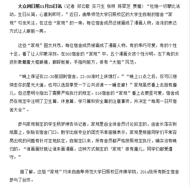 宿舍制定“家规”一事进行了报道。随后,人民网、中国青年网、中国日报网、甘肃网等数家媒体进行转载刊登。日照电视台《社会零距离》栏目也走进老王论坛