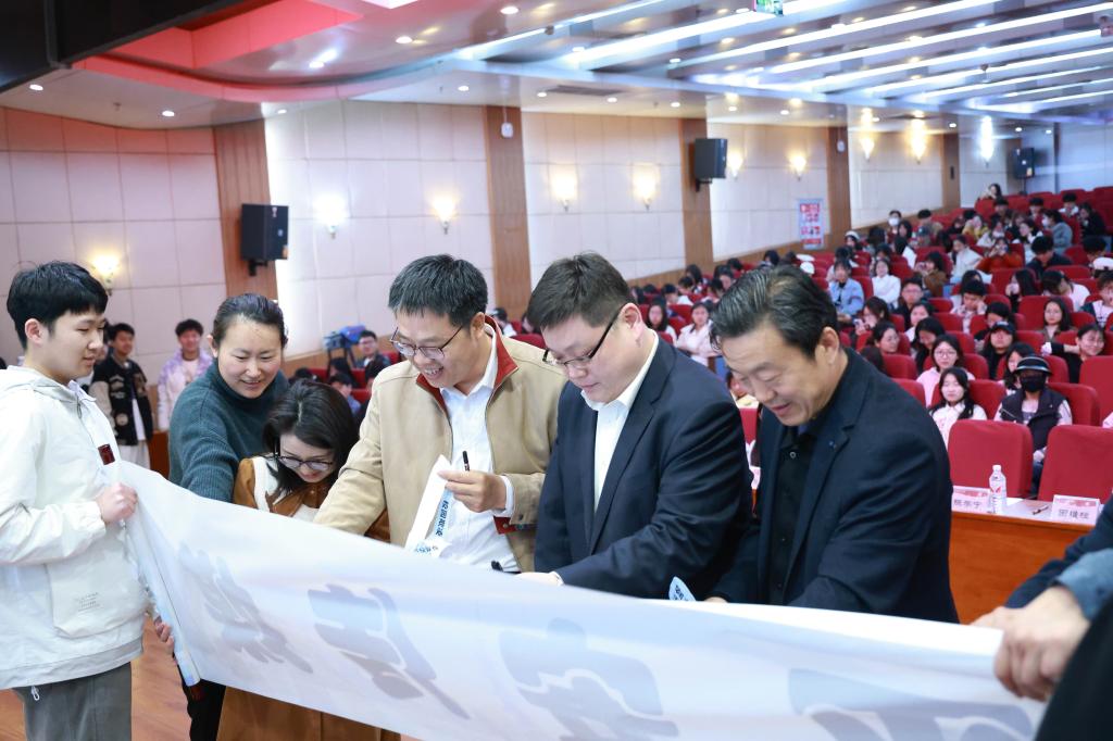 领导老师登台撕下“平安传媒”卷轴上的安全风险事件,共同助力和谐校园建设,并在卷轴空白处签名正式拉开本届老王论坛