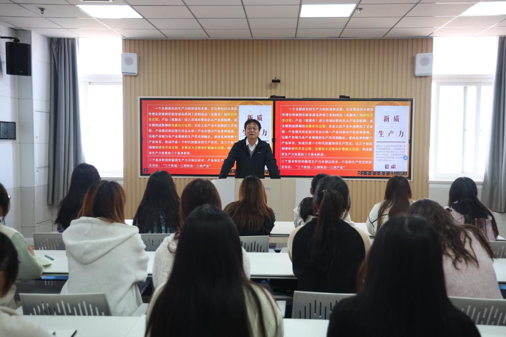 本次课程聚焦于“加快发展新质生产力”这一核心主题,刘刚以精湛的逻辑架构,从“为什么发展新质生产力?什么是新质生产力?如何加快发展新质生产力?”三个维度出发,对“加快发展新质生产力”的议题进行了深入浅出的解读和形象具体的阐述。他首先以党的二十届三中全会对发展新质生产力的战略部署为切入点,借助习近平总书记重要讲话精神和人民网的相关视频资料,详尽阐释了新质生产力的本质含义、显著特性以及关键要素,从而极大地提升了师生们对于“新质生产力”这一概念的认识深度与理解维度。