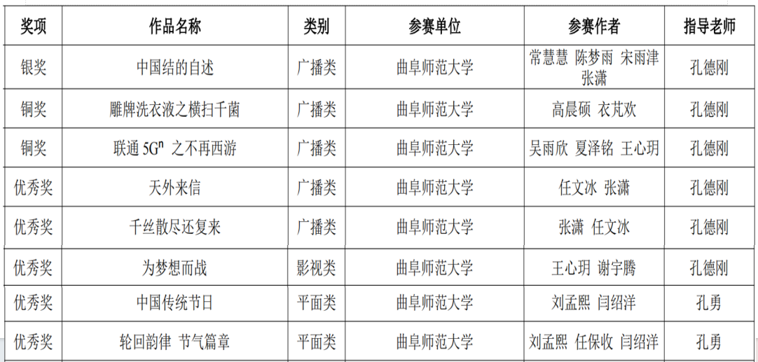 本次比赛的获奖作品主题多元、类别丰富,不仅涵盖了平面设计、广播广告、影视制作等多种艺术形式,还涉及了传统文化传承、校园生活风貌等多个领域。学子们以其独到的创意视角、新颖的想法和强劲的表现力,创作出了一系列优秀作品,充分展现了传媒学子深厚的专业基础和活跃的创新思维。其中,常慧慧等人创作的作品《中国结的自述》荣获广播类银奖;高晨硕等人创作的作品《雕牌洗衣液之横扫千菌》以及吴雨欣等人的作品《联通5Gn之不再西游》均获得了广播类别铜奖;王心玥等人共同创作的作品《为梦想而战》荣获影视类别优秀奖。