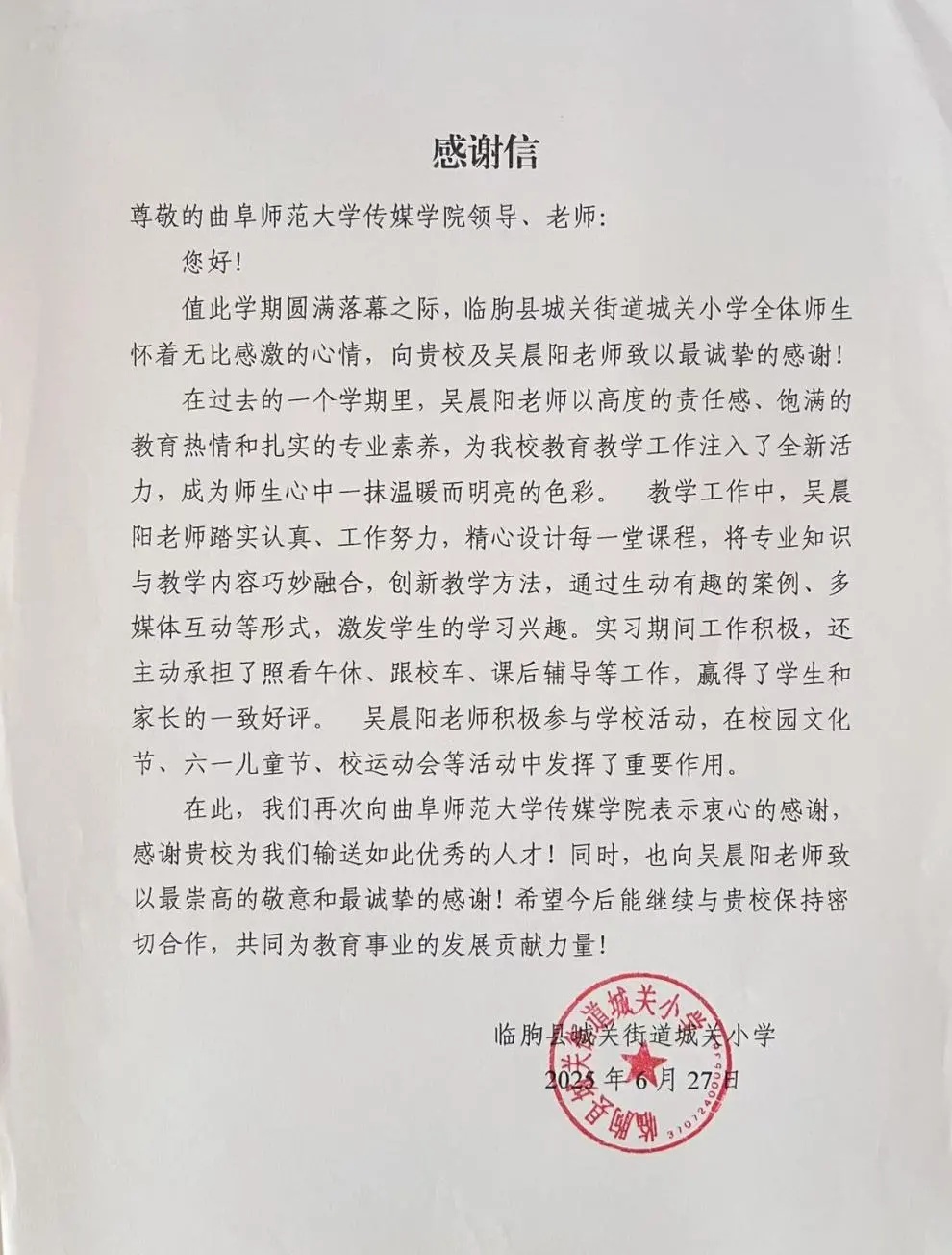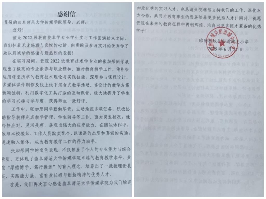 收到来自临朐县城关街道城关小学的两封感谢信,信中对我院2022级教育技术学专业张加彤和吴晨阳同学在实习期间的优异表现给予了高度评价,并对学院的人才培养质量和育人理念表示充分肯定。