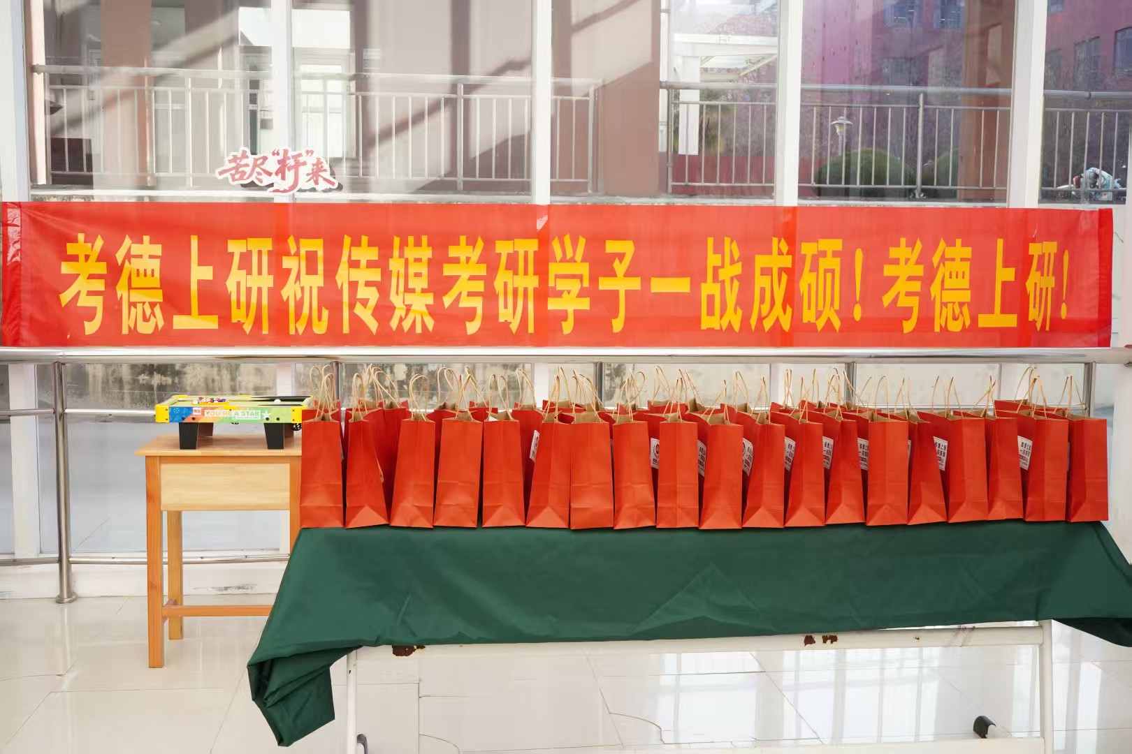 活动现场氛围温馨。印有“金榜题名”“前程似锦”字样的红色礼包格外醒目,其中不仅装有学院与考德上研机构精心准备的零食水果,还附有老师们亲笔写下的祝福卡片,承载着对学子们的殷切期望。到场同学均可领取一份专属礼包,感受来自学院的关怀与鼓励。