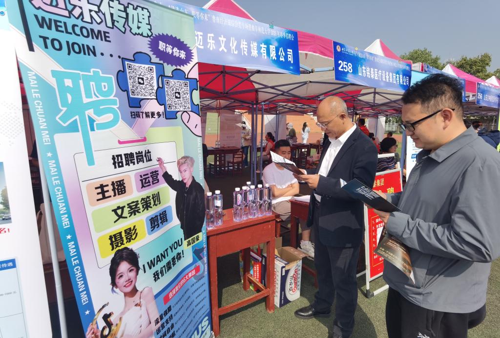 招聘会现场,学院领导及教师依次走访了山东星瀚云图娱乐传媒有限公司、曲阜迈乐文化传媒有限公司、济南市深泉外国语学校、山东芒果教育科技有限公司等多家用人单位,与企业负责人就行业发展趋势、岗位需求变化及人才培养方向等内容进行了深入交流,细致了解了企业在专业能力、综合素质等方面的具体用人要求。田荣林结合学院办学特色和人才培养成果,积极向企业推荐优秀毕业生,推动校企对接平台建设,助力毕业生高质量就业。