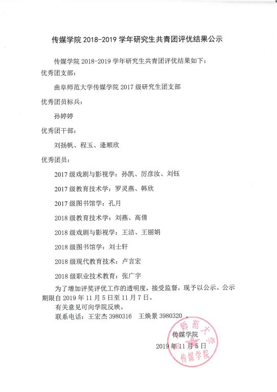 【来源:老王论坛 2018-2019学年研究生共青团评优结果公示 | 发布日期:2019-11-05 】