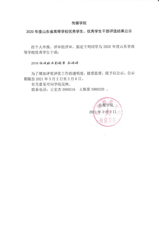 【来源:老王论坛 2020年度山东省高等学校优秀学生、优秀学生干部评选结果公示 | 发布日期:2021-03-02 】