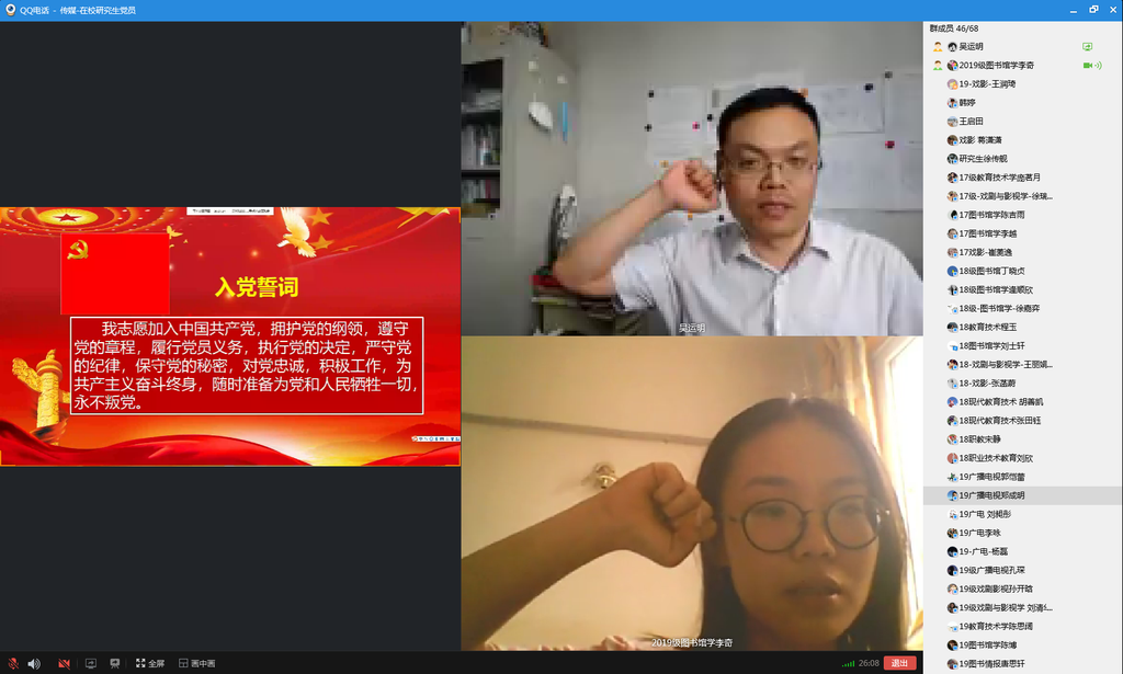 研究生党支部组织开展“重温入党誓词”主题党日活动。时时重温入党誓词,不忘入党初心,方能行稳致远;牢牢记住曾经誓言,点燃激情岁月,方能砥砺前行。